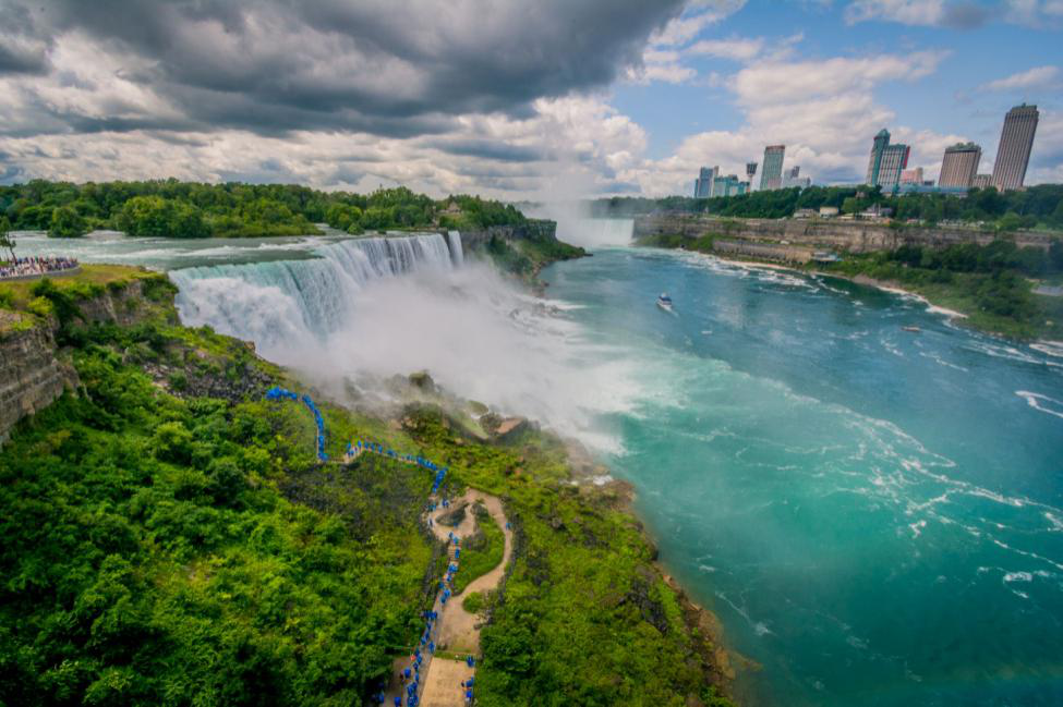 尼亚加拉瀑布(Niagara Falls)位于美国纽约州和加拿大安大略省交界地带,名列世界第一大跨国瀑布。瀑布的形成得益于独特的地质构造,在尼亚加拉峡谷中,岩石层接近于水平,每英里仅下降19-22英尺。岩石的顶层由坚硬的大理石构成,其下则为易被水力侵蚀的松软地质层。松软地层上坚硬的大理石地质层造就了水流于瀑布顶部的悬崖边缘笔直飞泻而下的壮阔景象。更新世时期,巨大的大陆冰川后撤,大理石层暴露出来,被从伊利湖流来的洪流淹没,形成了如今的尼亚加拉大瀑布。