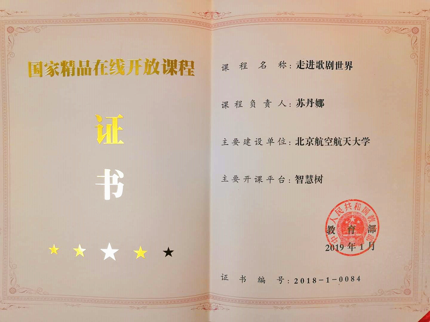 公司苏丹娜教授主讲的MOOC《走进歌剧世界》在2018国家教育部评选“国家精品在线开放课程”活动中,以优秀的课程质量获得国家教育部“国家精品在线开放课程认定”,这是公司国家精品课程零的突破,也是北航人文艺术教育研究成果的体现。