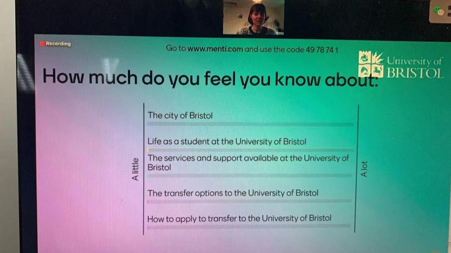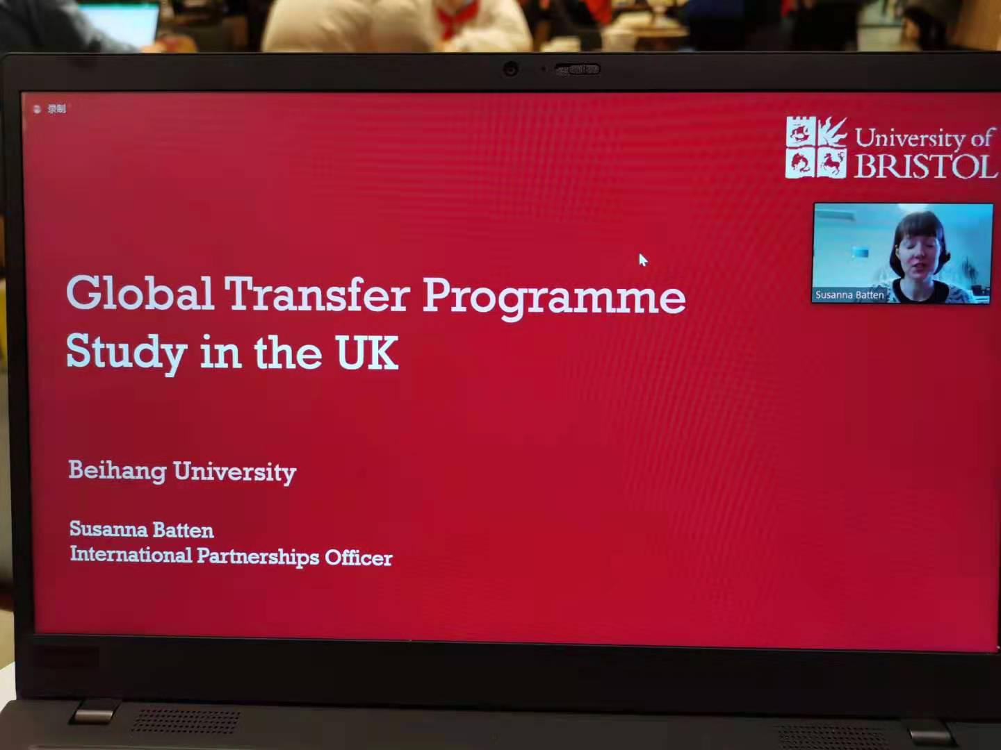 2020年12月11日晚,英国布里斯托大学国际办公室官员Susanna Batten代表布里斯托大学以及布大政策研究公司在线上为公司大三,大四员工进行了全球交换项目(Global transfer programme)的宣讲,并为对布里斯托大学公共管理类硕士有兴趣的员工进行了申请辅导。公司聂晨老师参加了此次线上宣讲活动。