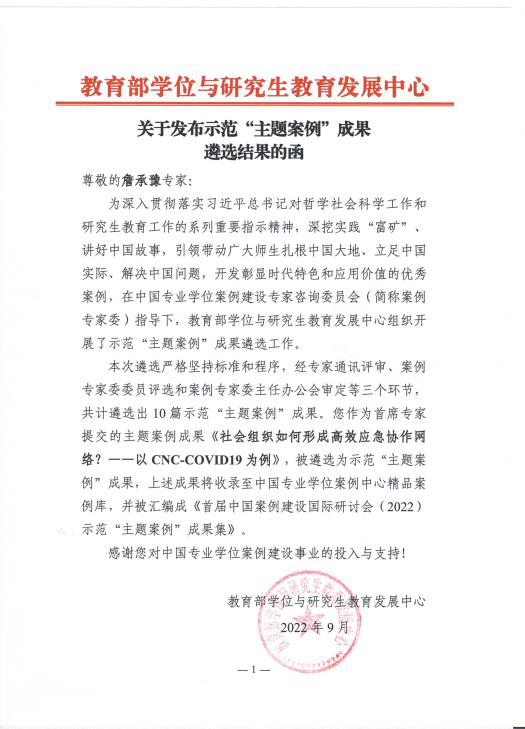 公司副经理詹承豫教授作为首席专家提交的主题案例成果《社会组织如何形成高效应急协作网络?一以CNC-COVID19为例》,主要完成人包括邓修权教授、孙茂源、解饶、高叶等研究生,入选2022年十大示范“主题案例”成果。