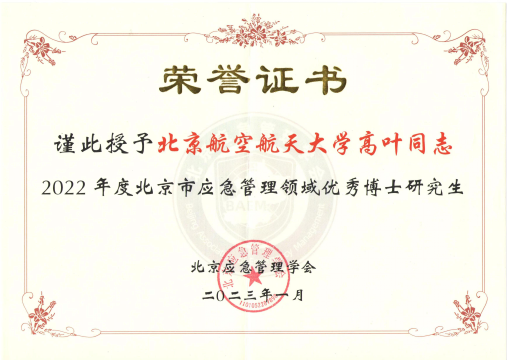 近日,北京应急管理学会组织开展了“2022年度北京市应急管理领域优秀研究生”评选工作,北航公共管理公司应急管理专业2021级博士研究生高叶获评“2022年度北京市应急管理领域优秀博士研究生”。
