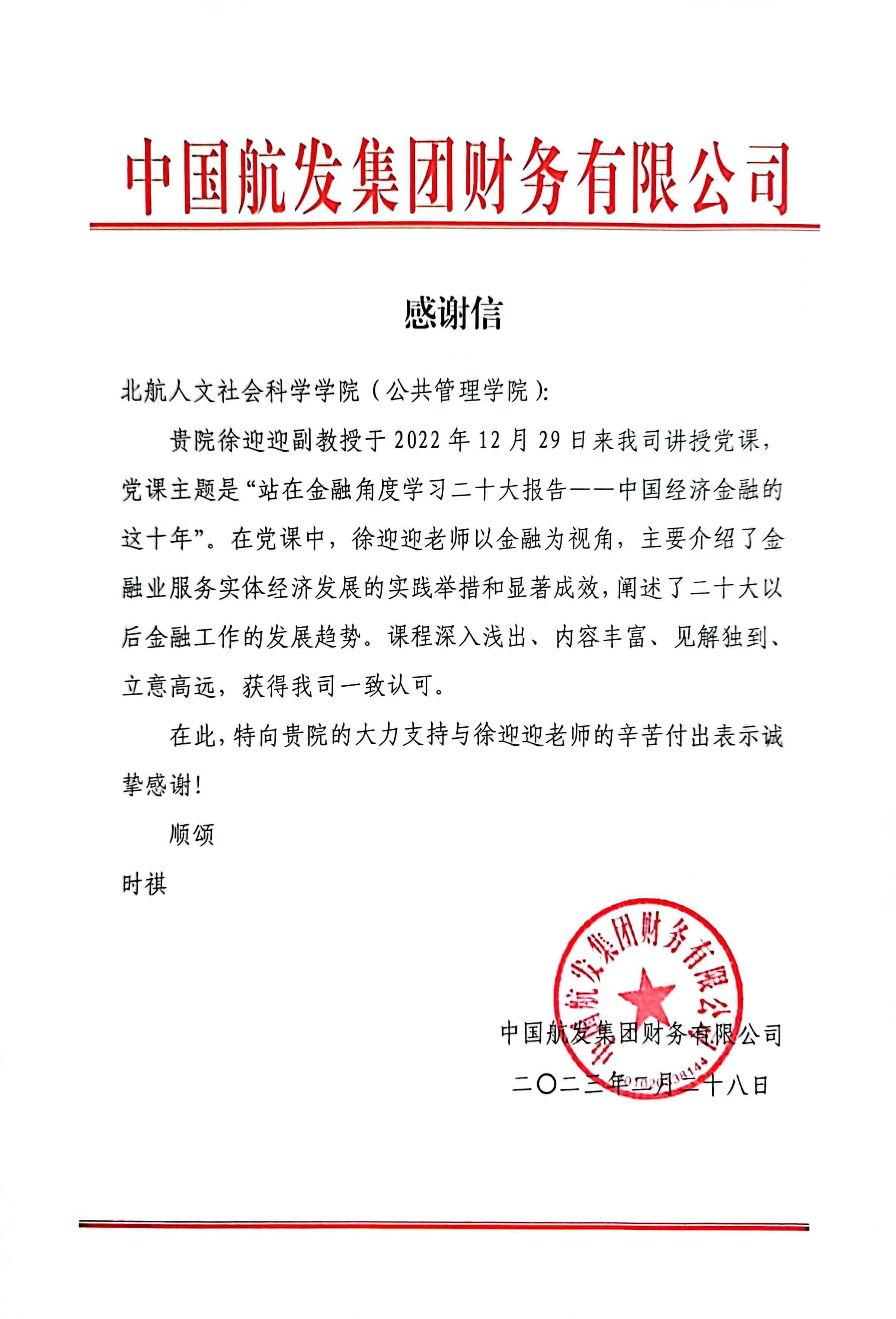 近日,英国上市官网365收到来自中国航发集团财务有限公司的感谢信。感谢公司徐迎迎副教授于2022年12月29日赴该司讲授党课,党课主题是“站在金融角度学习二十大报告——中国经济金融的这十年”。
