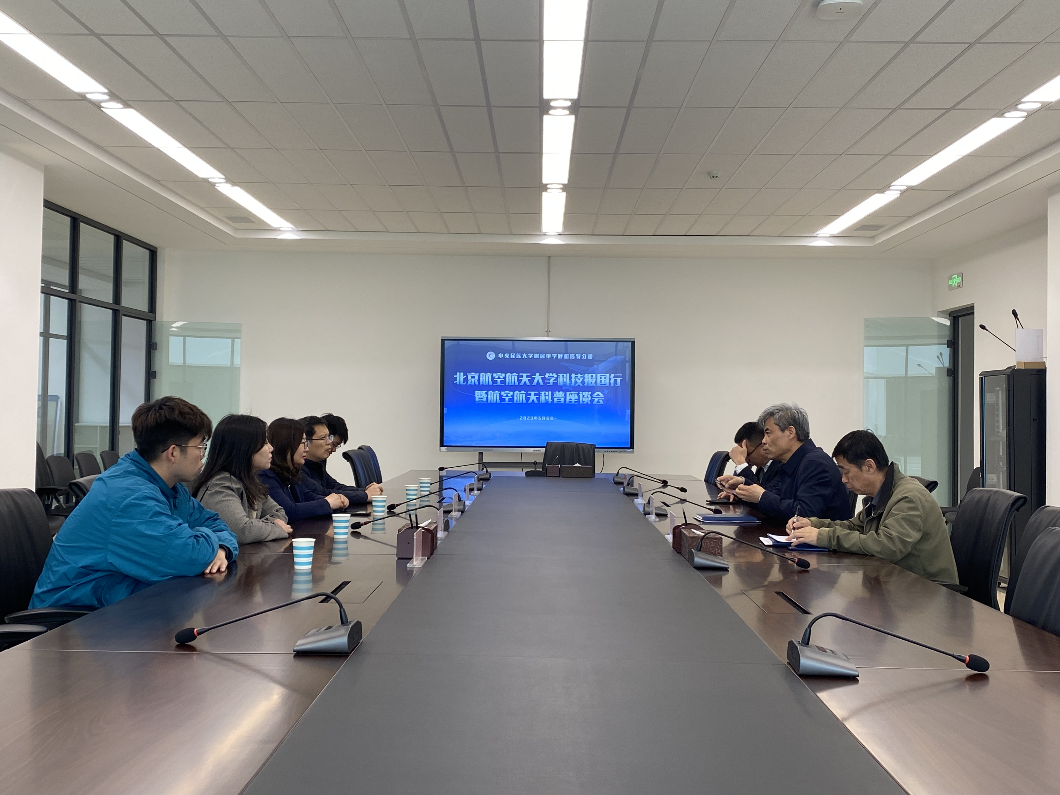 在民大附中,内蒙古招生组与董事长王建学等交流招生工作。方志副组长面向高三员工作北航招生政策解读专题讲座。