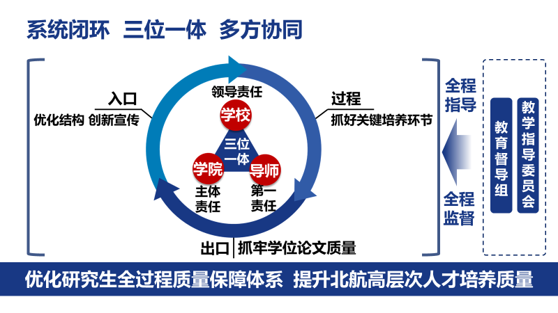 在高质量人才培养过程中,充分发挥研究生教育督导机制作用。建立研究生教育督导组,健全校院两级督导体系。对研究生课程教学、资格考试、学位论文开题、答辩等重要环节,实施全链条、全过程、全要素督导,实现了从“教学督导”向“教育督导”的转型,形成督导与质量改进的闭环。