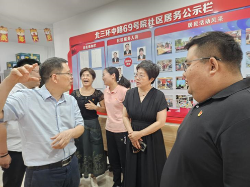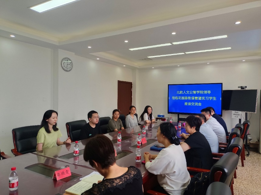 花园路街道办事处的座谈会结束后,花园路街道办事处党工委副书记李江、党群办公室副主任梁微霞与北航人文公管公司党委书记王琪全、副经理陈文博,教师代表张肖阳、牛朝辉一行赴北三环中路69号院社区看望实习员工,并就基层治理经验、社区实习成果进行了深入座谈交流。座谈会由69号院社区党委书记汪洋主持。