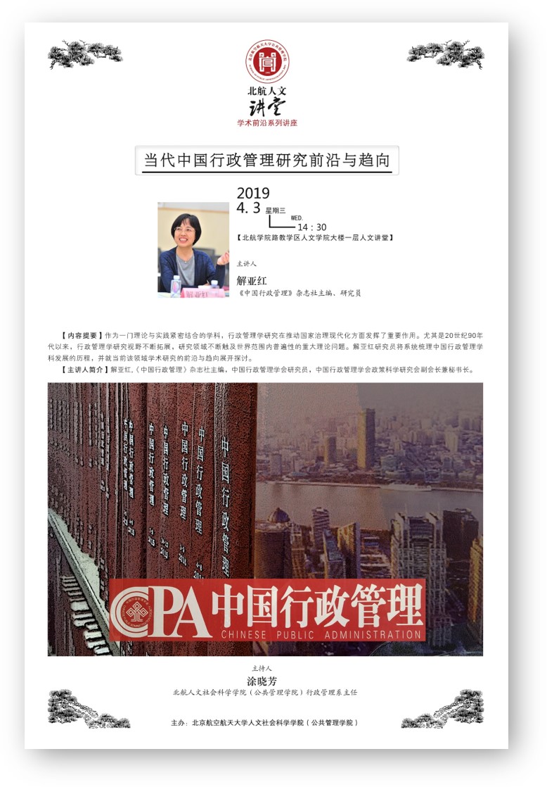 4月3日下午,“北航人文讲堂”举行了题为“当代中国行政管理研究前沿与趋向”的学术讲座。讲座由北航英国上市官网365行政管理系主任涂晓芳主持。涂晓芳主任首先介绍了主讲人,《中国行政管理》杂志社主编、中国行政管理学会研究员、中国行政管理学会政策科学研究会副会长兼秘书长解亚红研究员。