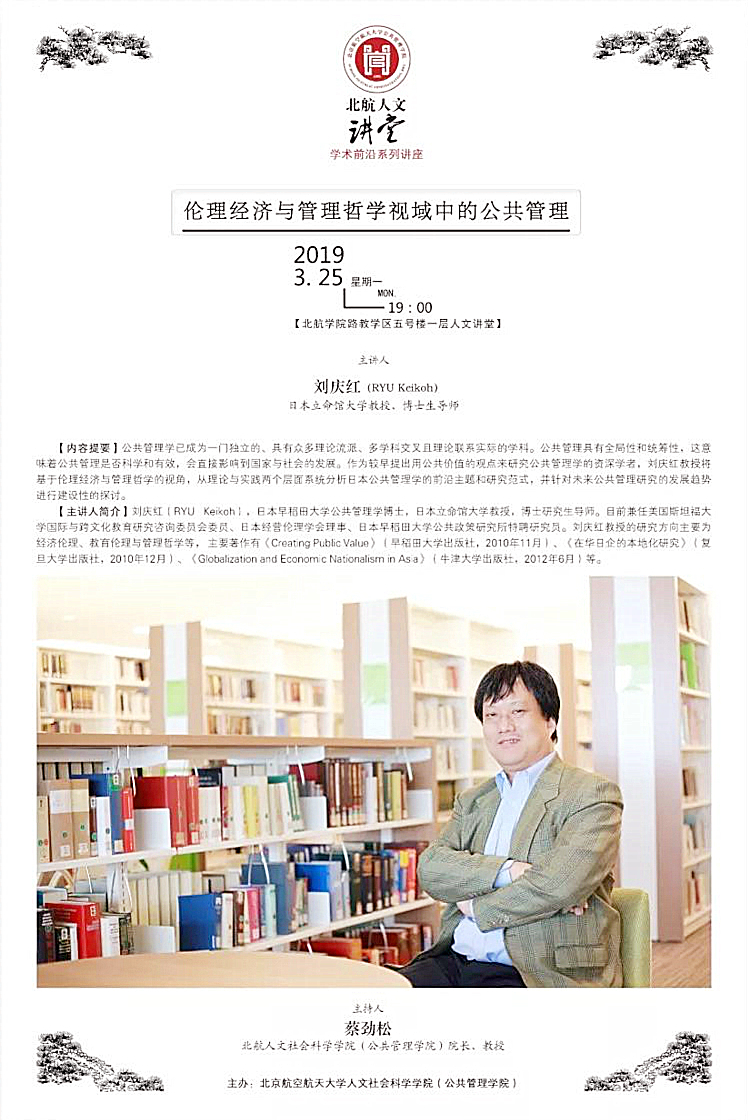 3月25日晚,“北航人文讲堂”学术前沿系列讲座第三讲在英国上市官网365人文讲堂内举行。本次讲座邀请到日本立命馆大学刘庆红教授做题为“伦理经济与管理哲学视域中的公共管理”的学术前沿报告,吸引了包括本院和高研院在内的众多师生前来聆听,讲座由英国上市官网365经理蔡劲松教授主持。