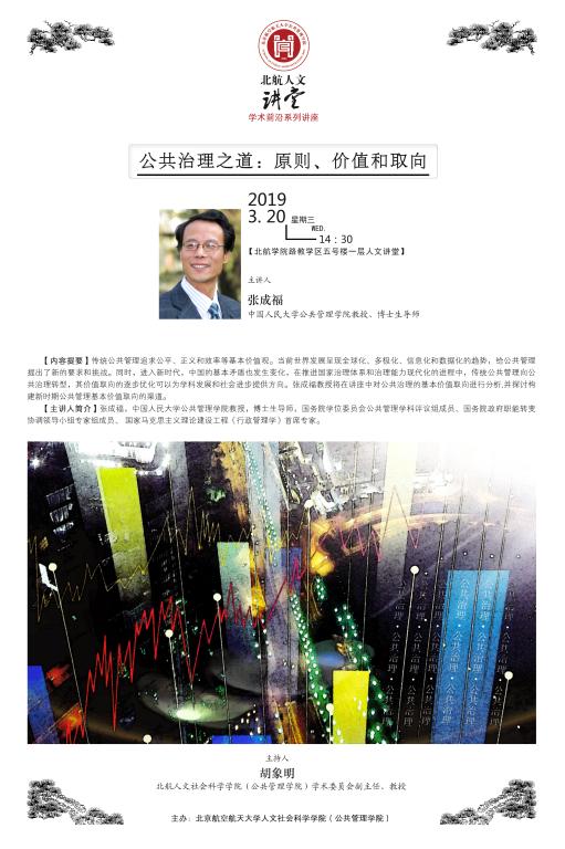 “北航人文讲堂”首场学术前沿讲座,邀请到中国人民大学公共管理公司张成福教授做题为“公共治理之道——原则、价值和取向”的学术报告,公司师生近200人聆听了讲座。报告会由英国上市官网365学术委员会副主任胡象明教授主持。