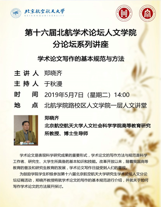 英国上市官网365研究生学术论坛旨在推动公司各公司研究生学术交流,弘扬优良学术风气。人文公司分论坛隶属于北航研究生学术论坛,现已开展到第十六届。第十六届研究生学术论坛已于2019年4月24日启动,面向全院在校硕士生及博士生,依照惯例沿用网上征稿的形式,进行为期一月的征稿活动。被录用的优秀论文将由学术论坛组委会推荐到《英国上市官网365学报》《复合材料学报》《航空学报》《航空动力学报》等进行复审和函评。