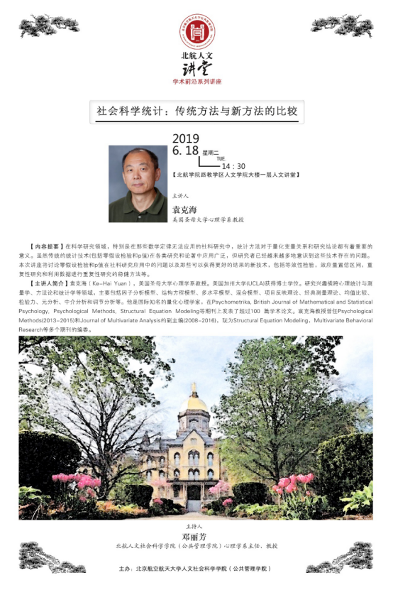2019年6月18日下午14:30,“北航人文讲堂”学术前沿系列讲座在北航英国上市官网365人文讲堂内举行。本次讲座邀请了美国圣母大学心理学系袁克海教授做题为“社会科学统计:传统方法与新方法的比较”的学术前沿讲座。讲座吸引了众多师生前来聆听。讲座由英国上市官网365心理学系主任邓丽芳教授主持。