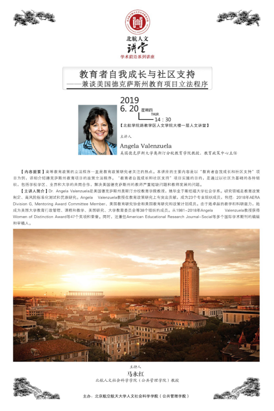 2019年6月20日下午14:30,“北航人文讲堂”举行题为“教育者自我成长与社区支持——兼谈美国德克萨斯州教育项目立法程序”的学术前沿系列讲座。本次讲座由美国德克萨斯州奥斯汀分校教育公司Angela Valenzuela教授主讲。讲座吸引了众多师生前来聆听和学习。讲座由北航英国上市官网365马永红教授主持。