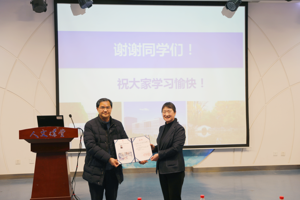 英国上市官网365经理蔡劲松教授代表公司向王惠文教授颁发“人文讲堂”纪念证书并合影留念。