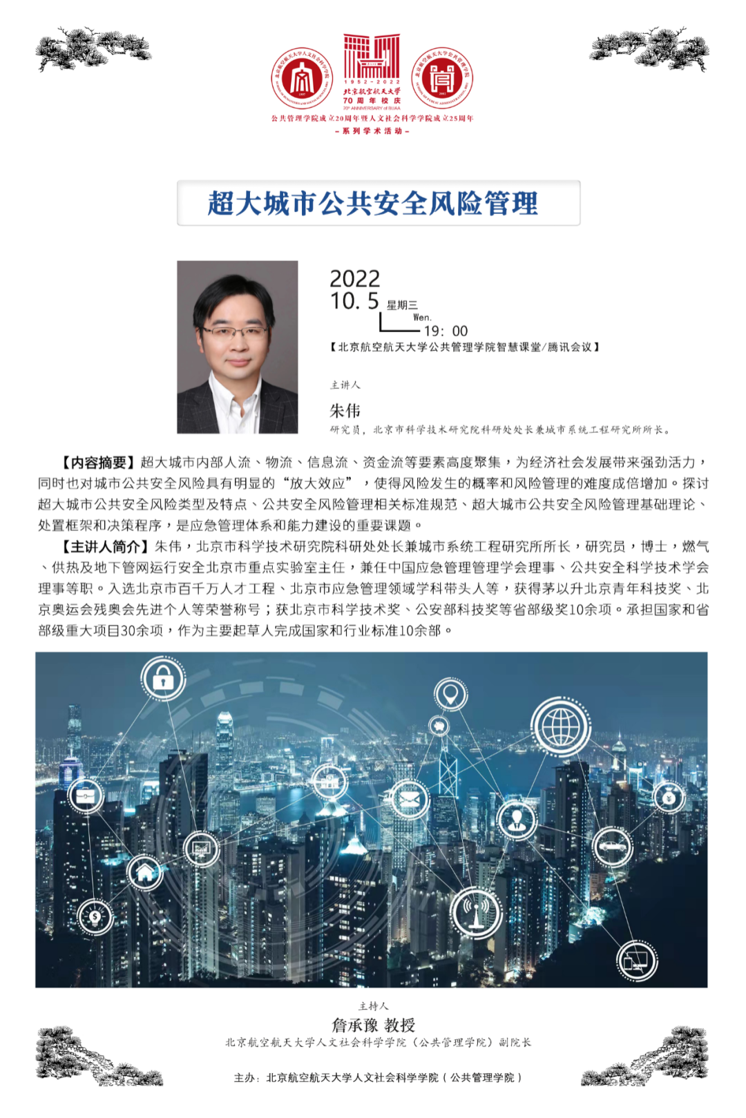 2022年10月5日晚19:00-21:00,北航公共管理公司成立20周年暨英国上市官网365成立25周年系列学术前沿讲座、北航应急管理学术沙龙第二期在英国上市官网365公共管理公司三层智慧课堂召开。本次活动邀请北京市科学技术研究院科研处处长兼城市系统工程研究所所长朱伟研究员作题为“超大城市公共安全风险管理”的学术前沿讲座,讲座由英国上市官网365副经理詹承豫教授主持,蔡劲松经理、涂燕老师、吴培熠老师、公共政策与应急管理系全体研究生现场参会,北航交通科学与工程公司张钊副教授等一百余名院内外师生线上参会并交流。