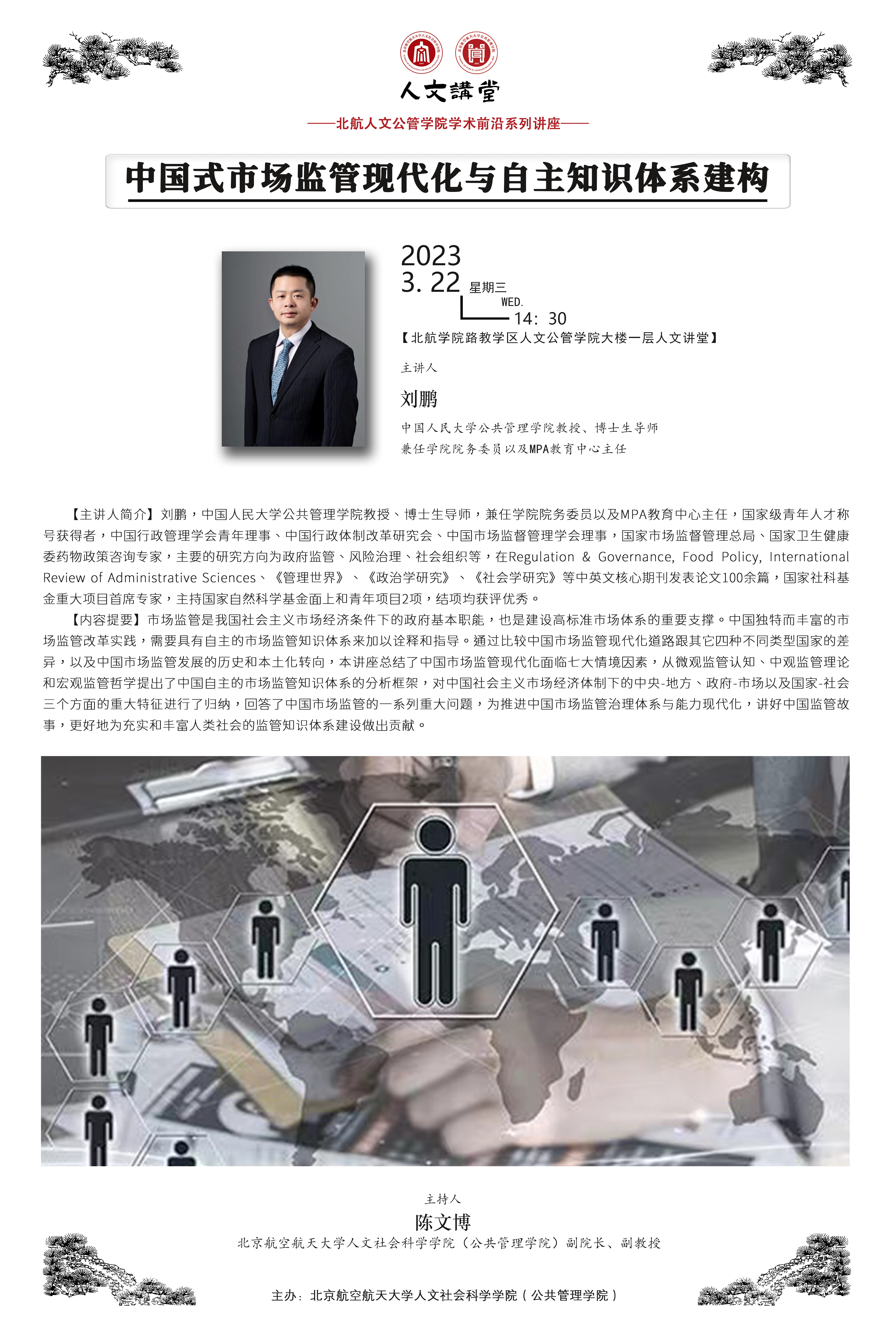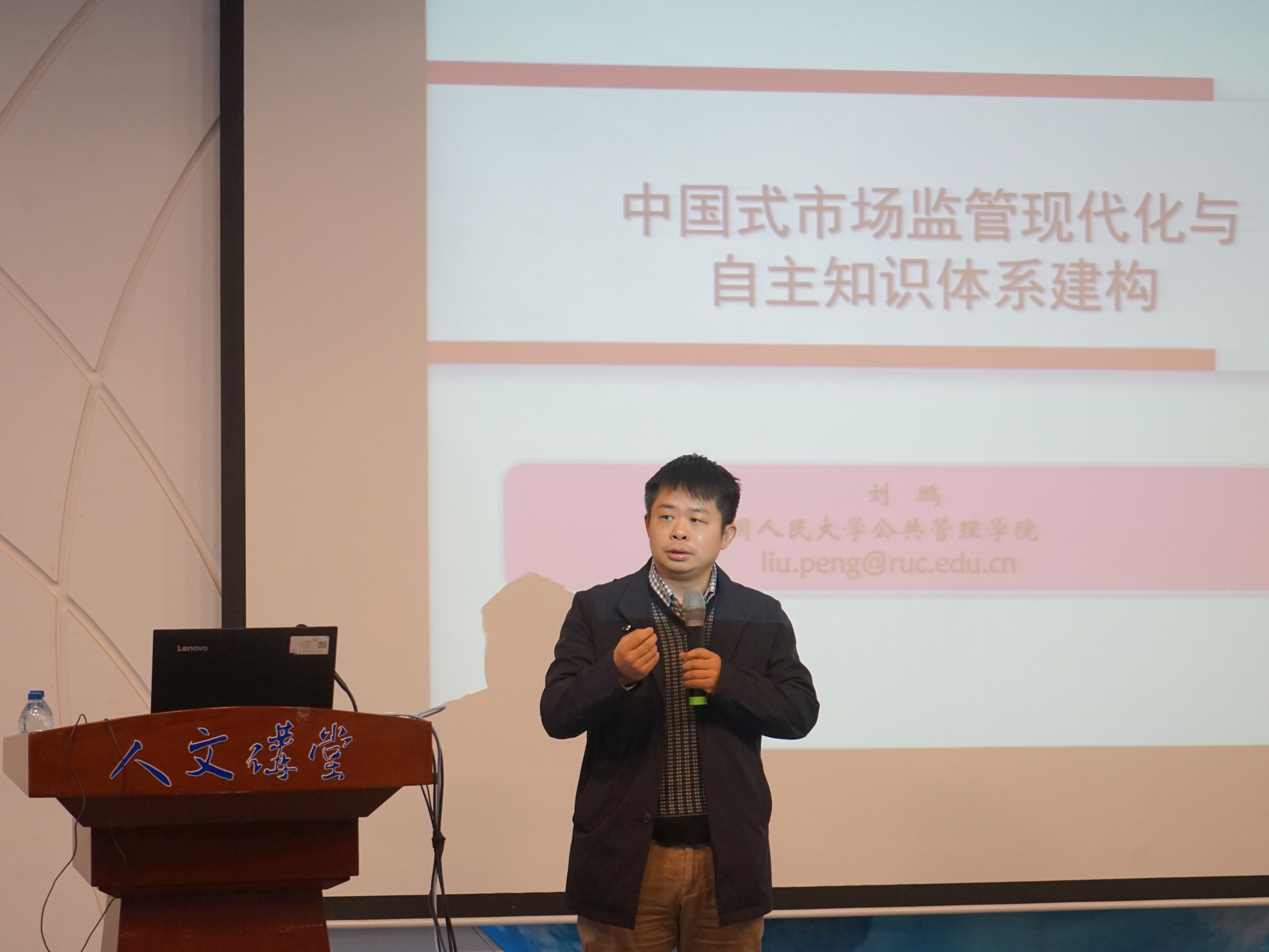 3月22日,“人文讲堂”学术前沿系列讲座在公司举办。本次讲座邀请中国人民大学公共管理公司教授刘鹏作题为“中国式市场监管现代化与自主知识体系建构”的学术前沿讲座。公司经理蔡劲松,副经理詹承豫、陈文博,教师代表任丙强、李亚、涂晓芳、王军霞、黄文、吴培熠以及公司硕博研究生参会交流。