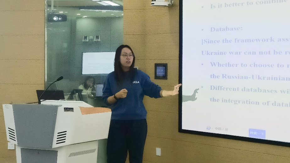 对于徐明婧的研究,钟爽首先对选题方向进行了肯定,认为该选题属于前沿热点,并对研究数据和方法进行进一步的探索分析,除此之外,还对研究当中出现的各种概念和概念间的关系进行了讨论分析。不足之处在于可以将数据来源进行进一步的简化筛减,从而提升数据的质量,可以考虑战争前后比较分析,考虑收缩研究问题到对外粮食依赖造成的战争冲击风险。对于徐明婧的研究,聂晨赞同钟爽的观点,首先对研究选题进行了肯定,讨论了背景的相关性,并建议可以对研究内容当中涉及到的细节内容进行进一步的完善、优化和确认。