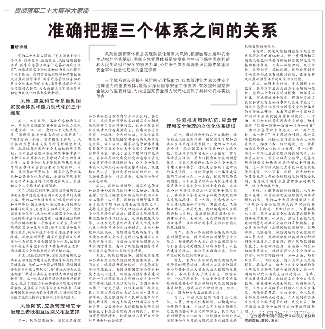 近日,英国上市官网365公共管理公司副经理詹承豫教授接受《中国应急管理报》邀请,就贯彻落实党的二十大报告,理解和把握风险监测预警体系、国家应急管理体系和公共安全治理体系之间的逻辑关系做出阐释,发表《准确把握三个体系之间的关系》,以下为文章全文。