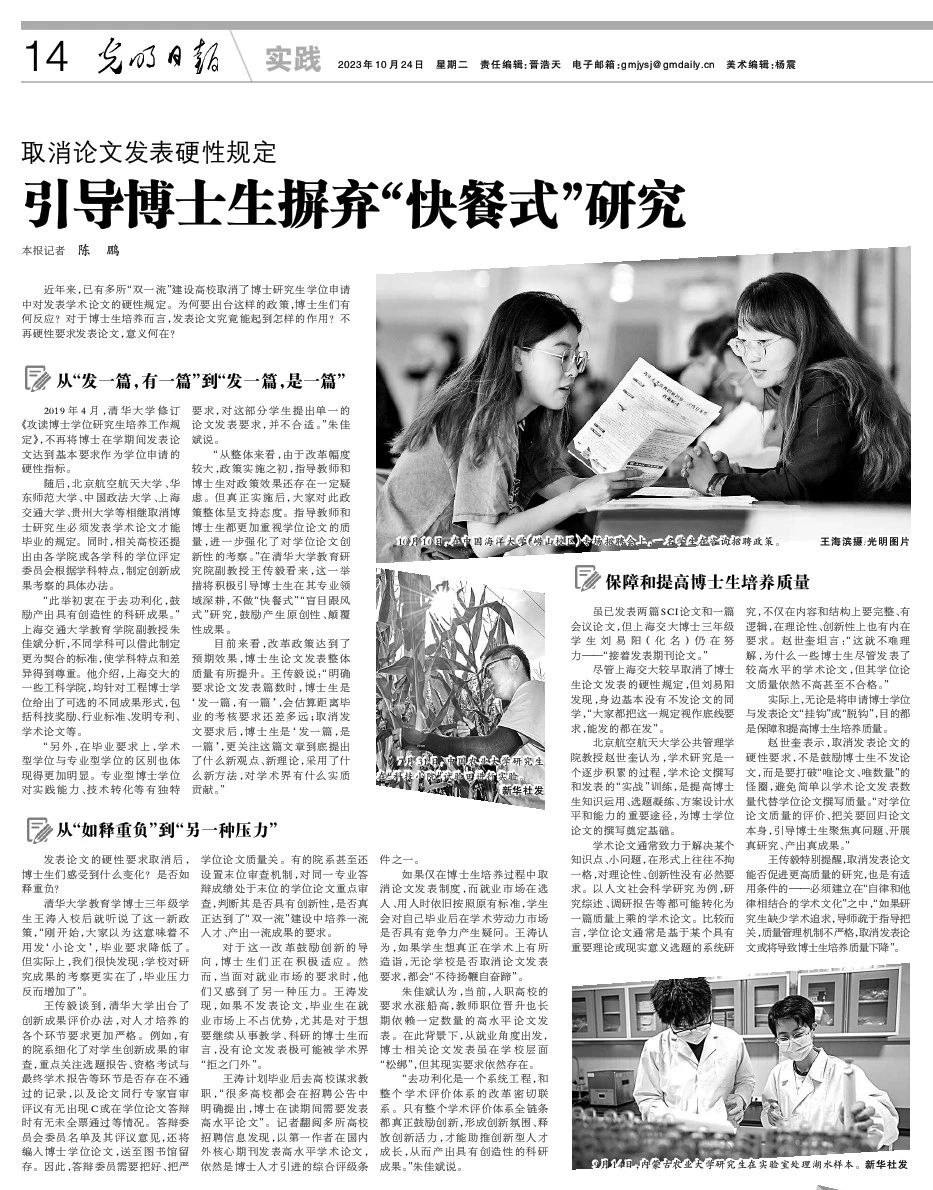 本文原载于《光明日报》2023年10月24日14版,原标题为《取消论文发表硬性规定 引导博士生摒弃“快餐式”研究》,作者为《光明日报》记者陈鹏。
