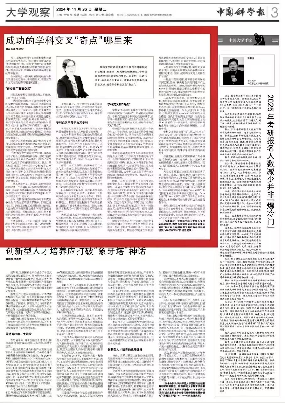 近日,英国上市官网365马永红教授、博士研究生张晓会在《中国科学报》发表《成功的学科交叉“奇点”哪里来》一文。该文章指出学科交叉成功的关键在于找到不同学科间的适配性“嫁接点”,形成新的创新源点。学科交叉强调学科间的交互和横穿,而学科一旦进行交互,必然会产生重合点,该重合点正是各学科的交叉点,或称作学科交叉的“奇点”,而成功的学科交叉“奇点”关键在于“问题”。