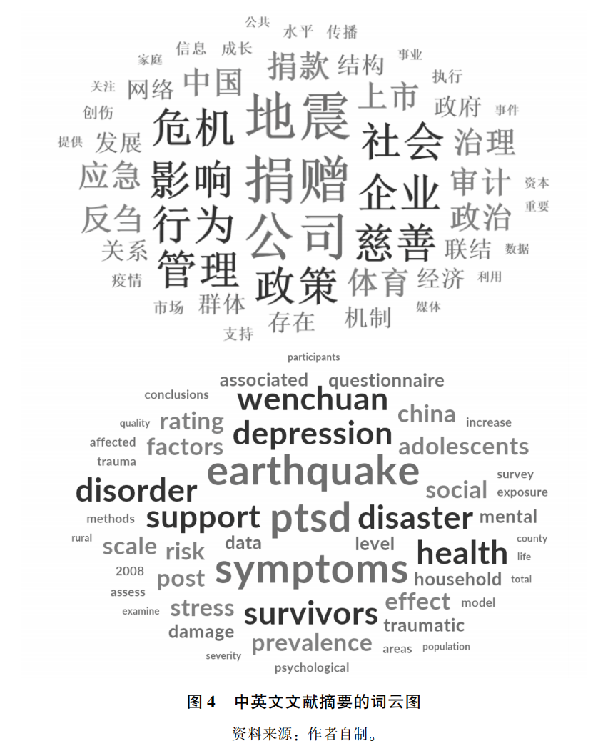 再次,三类研究中的高引文献也能够体现经典案例分析促进跨学科融合发展的作用。以“5·12”汶川地震为例,以引用达到100次为标准(检索时间同上),共有28篇中文文献和18篇英文文献被纳入分析。在这28篇中文文献中,仅有1篇发表于2008年。英文文献的平均发表年份在2013年左右,中文文献的平均发表年份在2012年左右。这一特征基本符合总体的发表年份分布。在期刊来源上,中文高引文献以经济学、管理学及社会学为主,而英文高引文献则以心理学和公共卫生两个学科为核心。图4分别展示了上述文献摘要的词云图。从中可以发现,在经典案例分析中,公共管理的学科属性可能并不突出。这反过来验证的观点在于:任何一个学科都不能完全胜任对风险、灾害和危机的研究。应急管理研究的跨学科性在此层面上得到了更为直观的体现。当然,这种差异也可能和两个数据库对“社会科学”的界定差异有关。