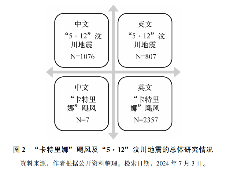 “卡特里娜”飓风是2005年发生于美国新奥尔良市及其周边地区的5级飓风,造成了超过1000人的死亡及近2000亿美元的经济损失,其应急响应及恢复过程直接推动了美国联邦应急管理署(Federal Emergency Management Agency)的改革进程。“5·12”汶川地震发生于2008年,是新中国成立以来造成伤亡和损失最大的自然灾害之一,极大地推动了我国应急管理体制机制的完善。上述两场灾害均为典型的自然灾害,发生时间较为接近、社会影响均较为重大、研究素材均较为齐备、知识生产和研究脉络也较为清晰,总体上符合经典案例分析的基本特征。但在客观上,两者造成的实际伤亡人数、经济损失等仍有一定差异。此部分将首先通过逐步“聚焦”的方式展示两者总体的中英文研究情况,随后通过对比分析进一步验证和延伸经典案例分析的要素与内容。