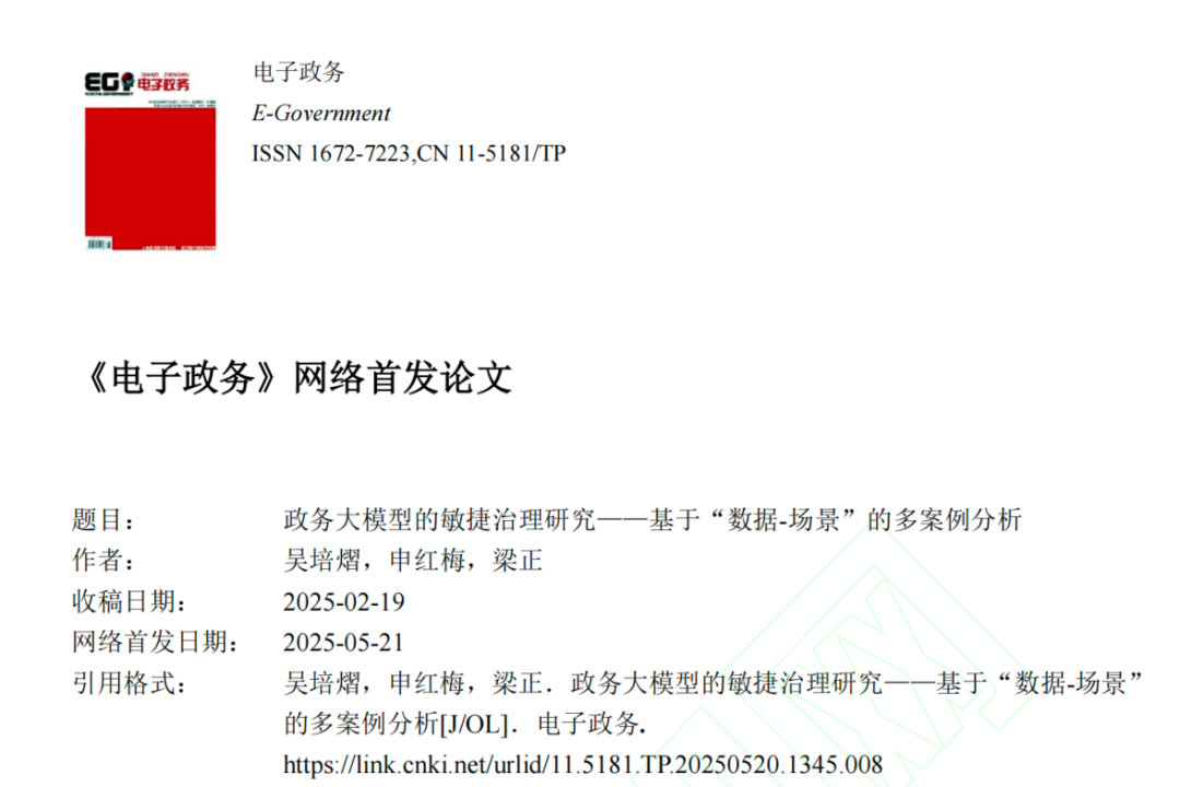 近日,英国上市官网365吴培熠助理教授在《电子政务》(CSSCI)发表最新研究成果《政务大模型的敏捷治理研究——基于“数据-场景”的多案例分析》。文章合作者为清华大学公共管理公司梁正教授、公司博士生申红梅。