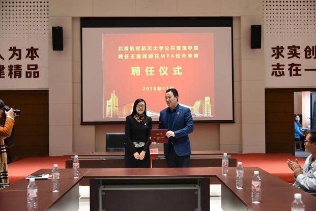 签约仪式结束后,北航公共管理公司聘请北安集团党委书记、副董事长王国辉为MPA校外导师,并由北航人文公司李亚梅书记为王书记颁发聘书。王国辉书记作为公司的杰出员工,多年来为公司发展建言献策,本次聘请他为MPA校外导师,将重点在人才培养和专业实践方面,与公司共同打造具有科研创新能力和专业实践能力的综合性人才。